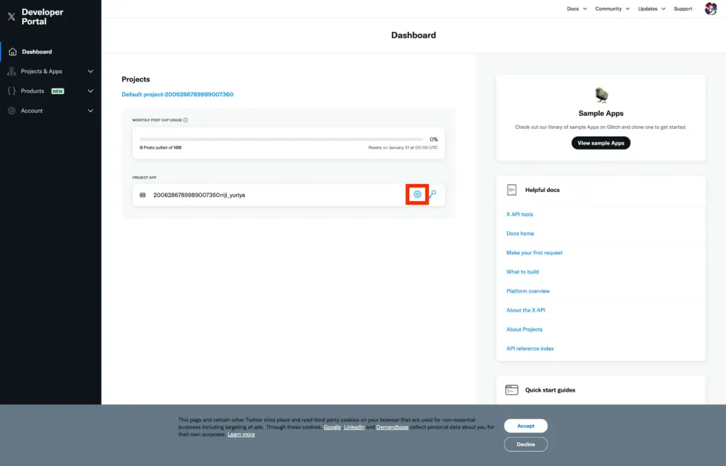 この時、右上のアイコンが自分がAPIを使いたいアカウントになっているかどうかを確認してください。