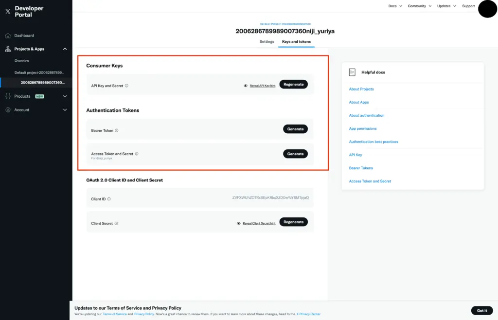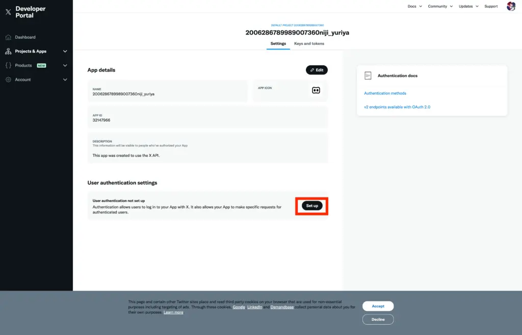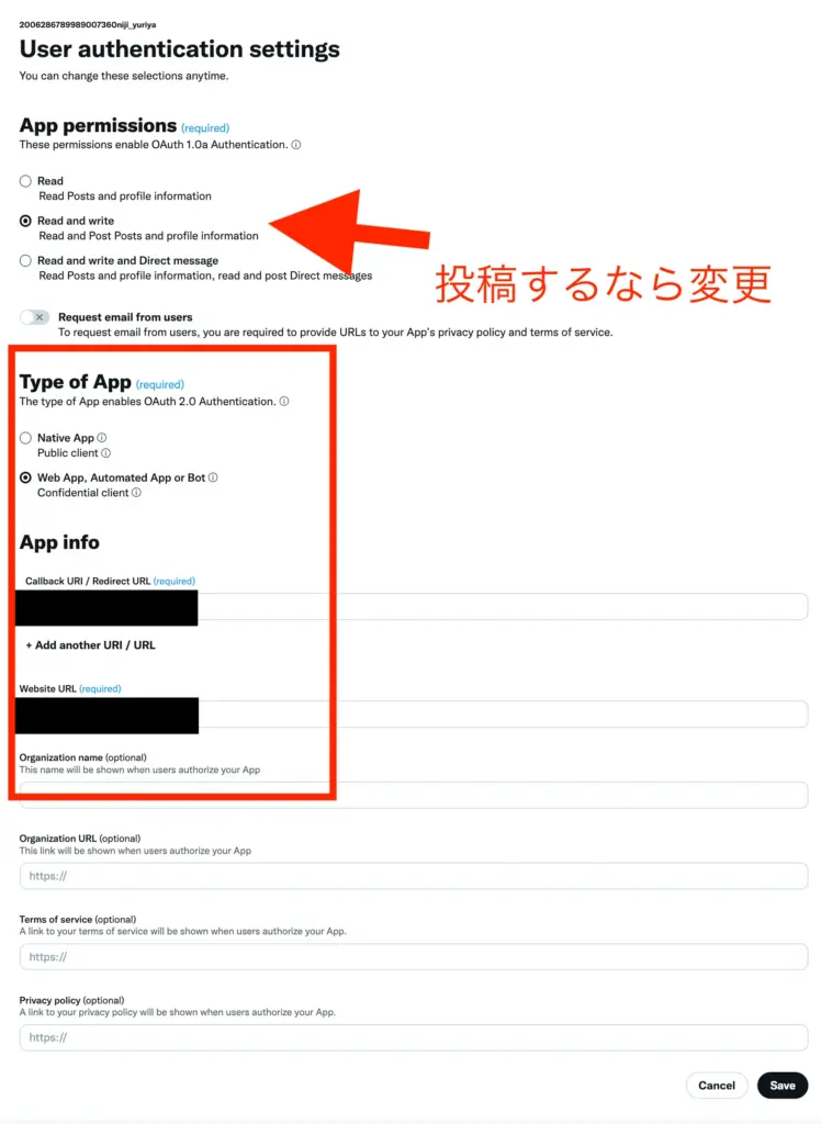 自分がやりたいことに応じて権限やURLなどを設定していきます。XにAPI経由で書き込みをしたい場合は、Read & Writeに権限を変更してください。