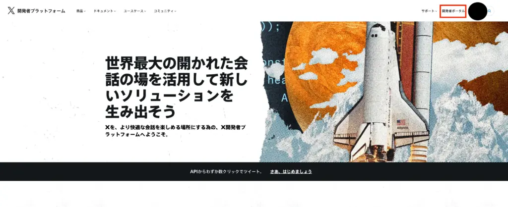 開くと下記のような画面に遷移するので、右上の開発者ポータルをクリックします。